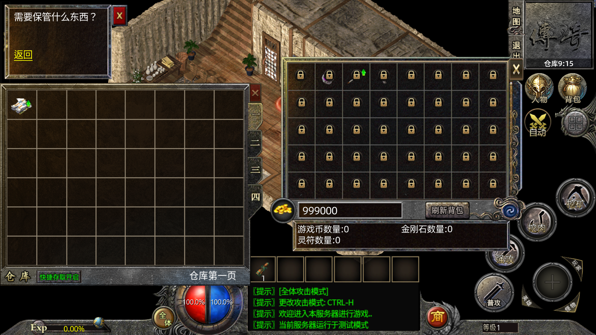 我的设置是登录脚本中吧所有仓库都关闭了,然后再到仓库中开启第一个仓库,然后退出重新登陆,存放物品就显示都带锁,但是能正常存第一页
