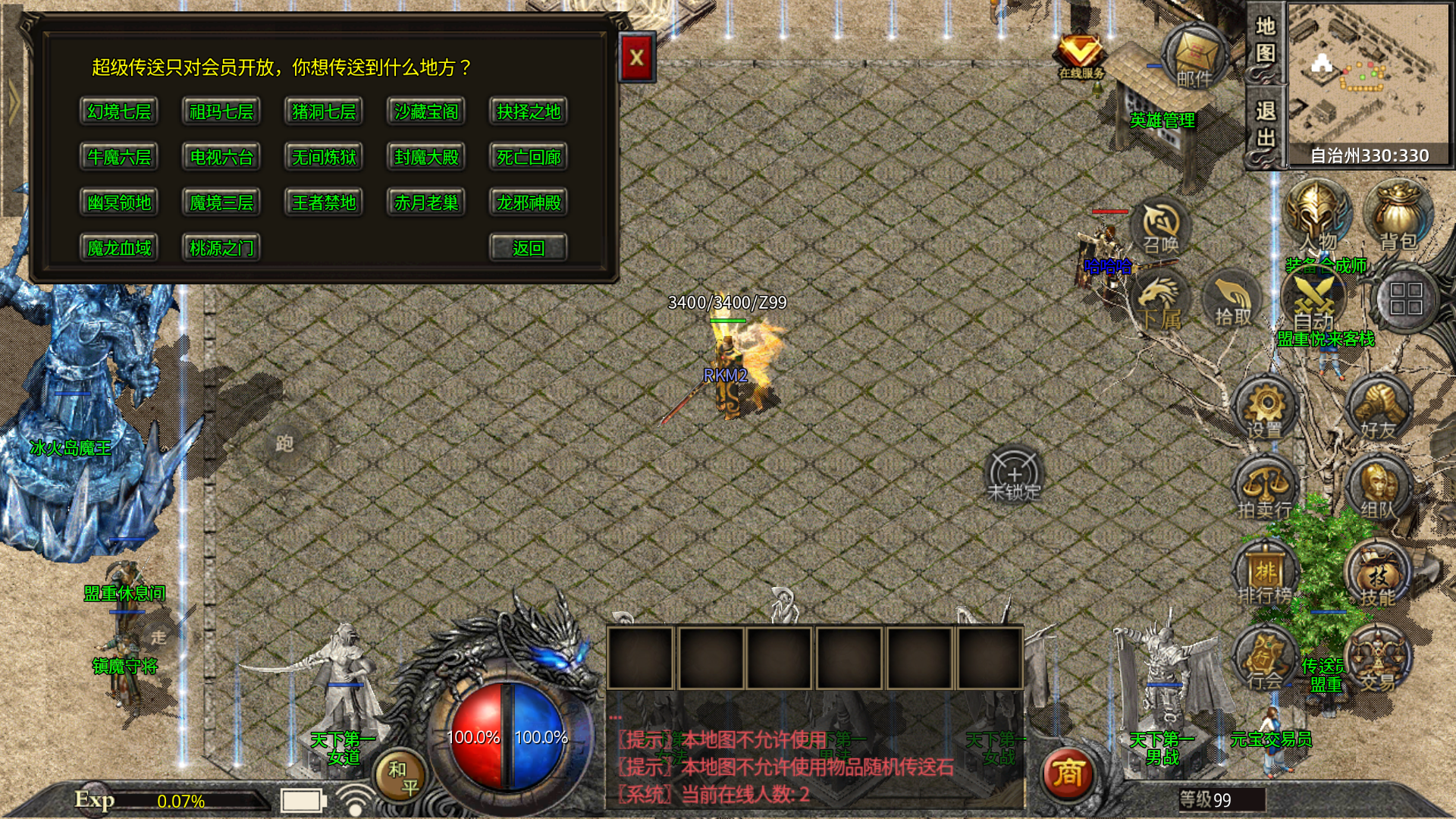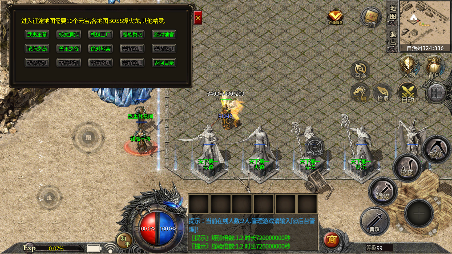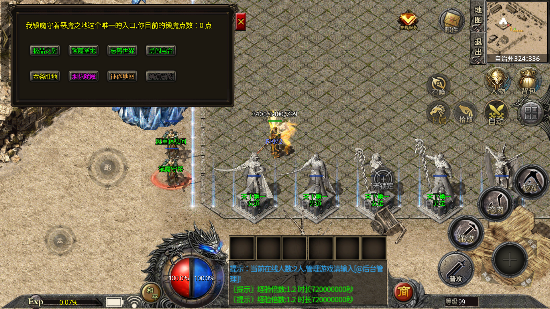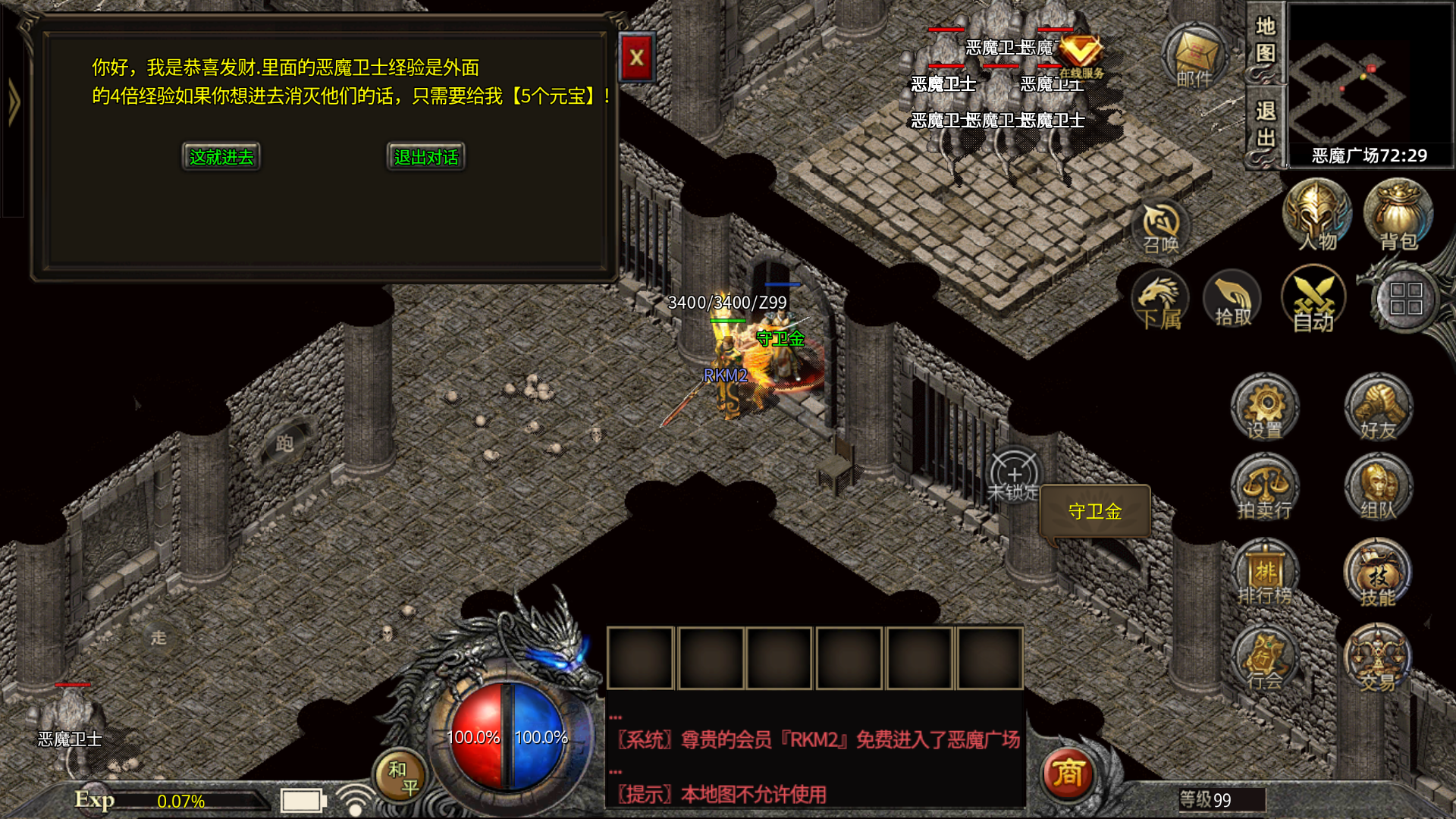 【练级系统】55级前可在休息间,55级后可在恶魔一层或会员练级地图用元宝自助刷怪。.√.